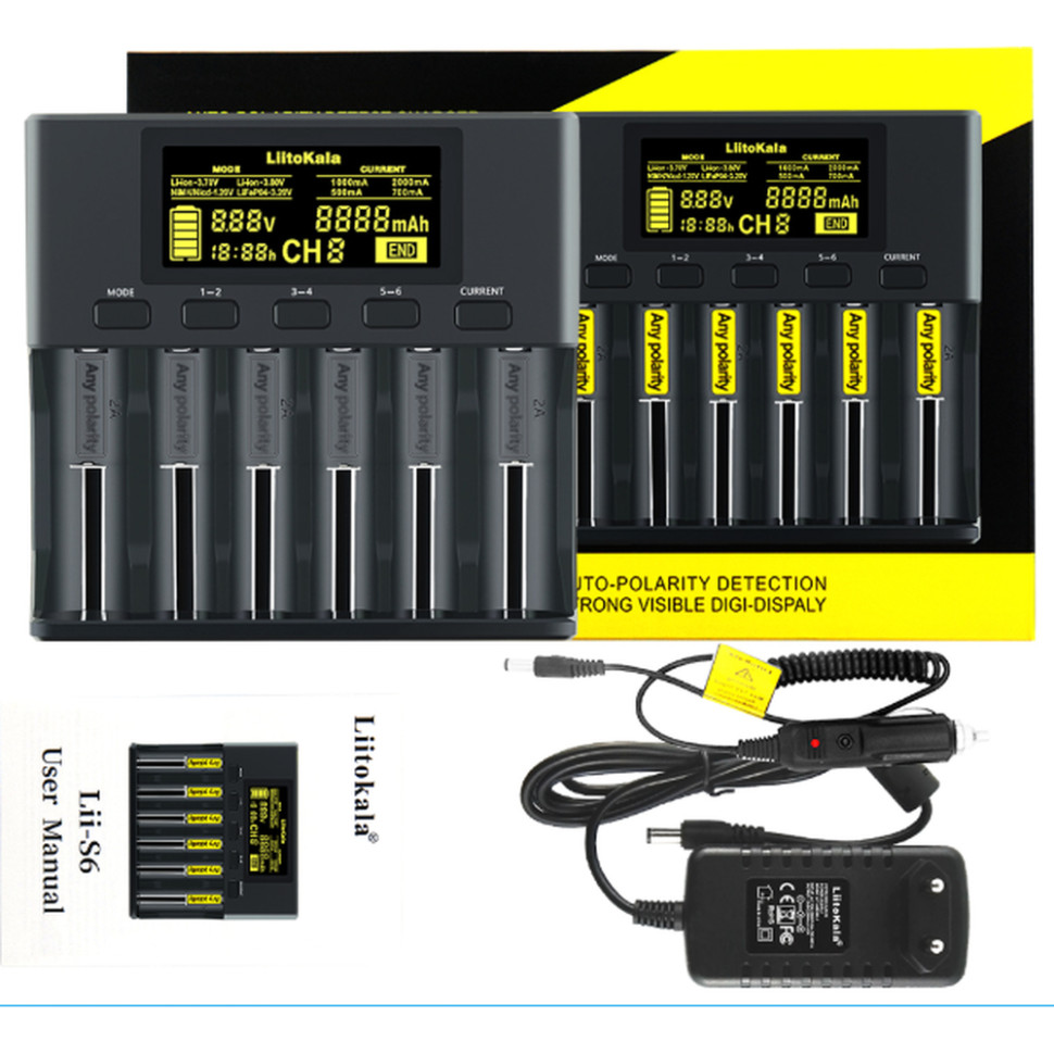 Універсальний зарядний пристрій LiitoKala Lii-S6 EU на 6 каналів + автомобільний кабель