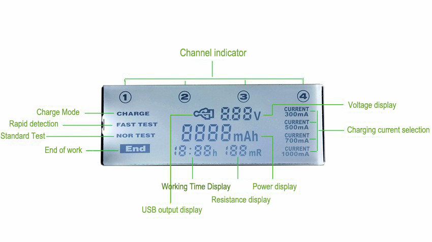 Зарядний пристрій підтримує Li-Ion акумулятори формату 11440/14500/16340/18650/26650 (включаючи проміжні), і Ni-Cd, Ni-MH акумулятори формату AA, AAA, C. Крім того, в зарядному пристрої є USB-вихід, що дозволяє використовувати це ЗУ в якості резервного джерела живлення для телефонів, навігаторів та ін портативних пристроїв (функція power bank). Широкий вибір зарядних струмів - від 300мА до 1000мА дозволяє не нашкодити акумуляторам з низькою ємністю і швидко зарядити високоємні акумулятори.