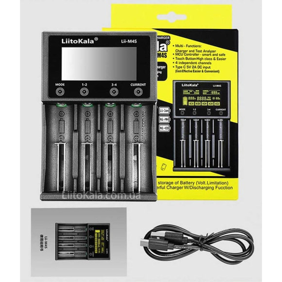 Характеристики: Модель: LiitoKala Lii-M4S Smart Universal LCD Fast Charger; Живлення постійного струму: 5V, 2А min., кабель живлення USB Type-C у комплекті; Напруга та струм заряду:для Ni-Mh/Ni-Cd: 1.48V; 300mA х 4, 500mA х 4, 700mA х 4, 1000mA х 2; для Li-Ion: 4.2V; 300mA х 4, 500mA х 4, 700mA х 4, 1000mA х 2; для USB: 5V, 1000mA; Струм розряду: 250 mA х 4, 500 mA х 4; Кількість слотів для акумуляторів: 4 незалежні канали; Розмір акумуляторів, що заряджаються:1.2V Ni-Mh/Ni-Cd акумулятори: АА, ААА, С (R14), SC; 3.7V Li-Ion акумулятори: 18650, 14500, 18490, 18350, 17670, 17500, 16340 (rcr123a), 10440, 26650, 22650, 2 будь-які циліндричні акумулятори діаметром до 26 мм і довжиною до 72.7 мм; Інформаційний дисплей з підсвічуванням; Тип акумуляторів, що заряджаються: Ni-MH, Ni-CD, Li-Ion; Характеристики