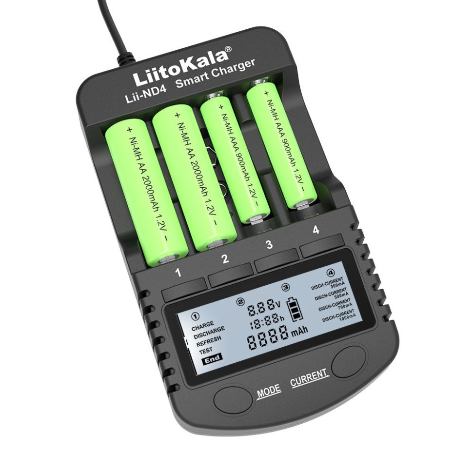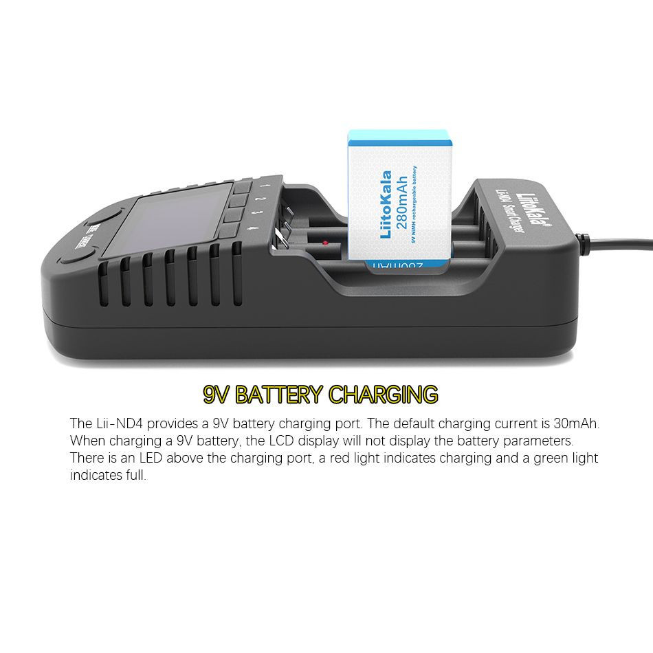 Універсальний зарядний пристрій Liitokala Lii-ND4 для заряду пальчикових Ni-MH або Ni-Cd акумуляторів або акумулятора типу "крона" 6F22.