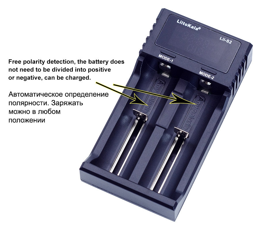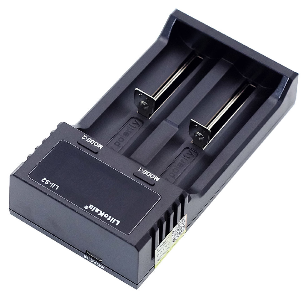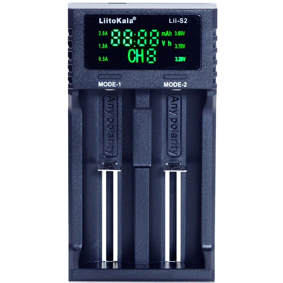 Кількість слотів для акумуляторів: 2 незалежних канали з рухомим контактом "мінус". Можна заряджати одночасно акумулятори різних типів, розмірів і ємності, кожен акумулятор заряджається незалежно від всіх інших. Визначення ємності. Зарядний LiitoKala Lii-S2 визначає ємність акумулятора по заряду. Сумісно з наступними типами батарей:Ni-MH /Ni-Cd: a, АА, ААА, Аааа, C (R14), SC; Li-ion 4.2 V/4.35 V (у тому числі ICR/IMR/INR)/LiFePO4/: від 10440 до 26650, у тому числі 18650, 14500, 16340, 20700, 21700; підходить для акумуляторів 18650 із захистом; підходить для акумуляторів 20700/21700; підходить для акумуляторів розміру C (R14). Струм заряду: 0,5 A /1A /2аNi-MH /Ni-Cd: 500 мА*2; Літій-іонний: 500 мА * 2/1000 мА * 2/2000 мА * 1; LiFePO4: 500 мА * 2/1000 мА * 2/2000 мА * 1. Автоматичне визначення повного заряду акумуляторів:Ni-MH /Ni-Cd: 1,48 В ± 1%; Літій-іонний: 4,2 в /4,35 в ± 1%; LiFePO4: 3,65 В ± 1%. Інформаційний дисплей з підсвічуванням на який виводиться поточна напруга акумулятора, струм заряду, тип акумулятора, накопичена ємність в поточний момент. Автоматичне визначення полярності-акумулятори можна вставляти в слот будь-якою стороною. Активація сильно розряджених Li-ion акумуляторів. Живлення зарядного пристрою: будь-який USB джерело живлення DC 5V /2A (в комплект не входить). Комплект поставки: